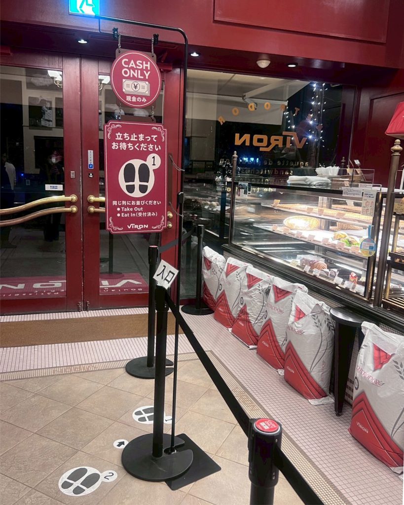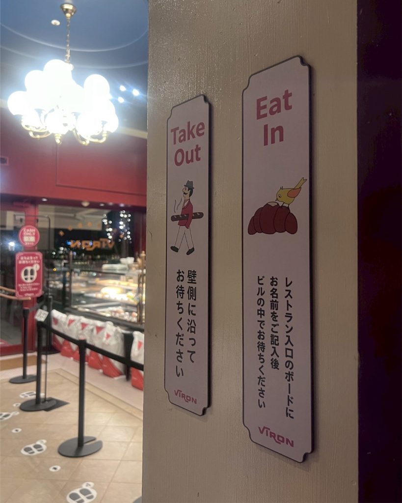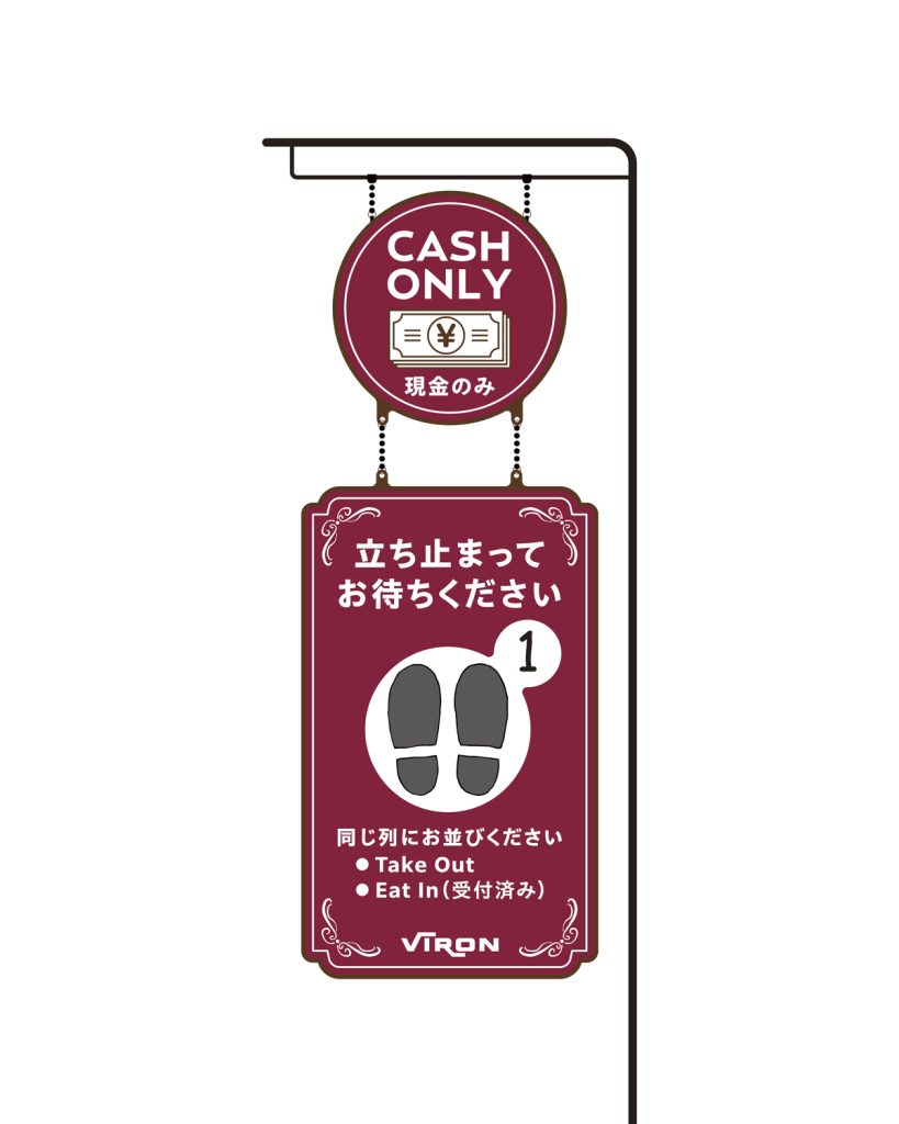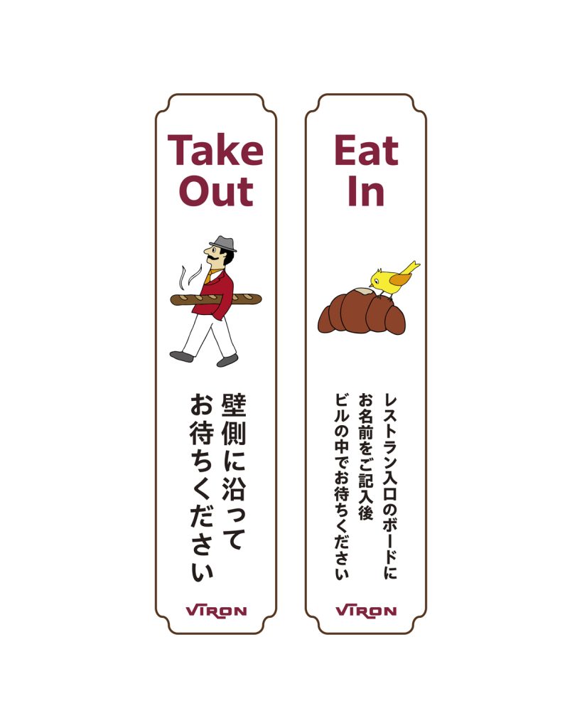 VIRON丸の内店様の店内案内サインを制作しました。テイクアウトとイートインのお客様がスムーズに並べるため、列の先頭を示す案内サインと「Take Out/Eat In」の待機案内サインの2種類を制作しています。店舗のキーカラーであるボルドーを基調に、店内の雰囲気に調和するデザインにまとめました。
